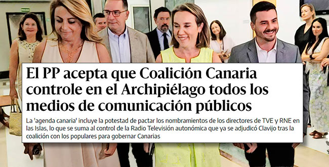 El reciente acuerdo del Partido Popular con Coalición Canaria para la investidura de Núñez Feijóo entrega al presidente de Canarias el control de todos los medios de comunicación públicos en esta Comunidad Autónoma, otorgándole una potestad que no le corresponde para el nombramiento de la dirección de RTVE en Canarias.